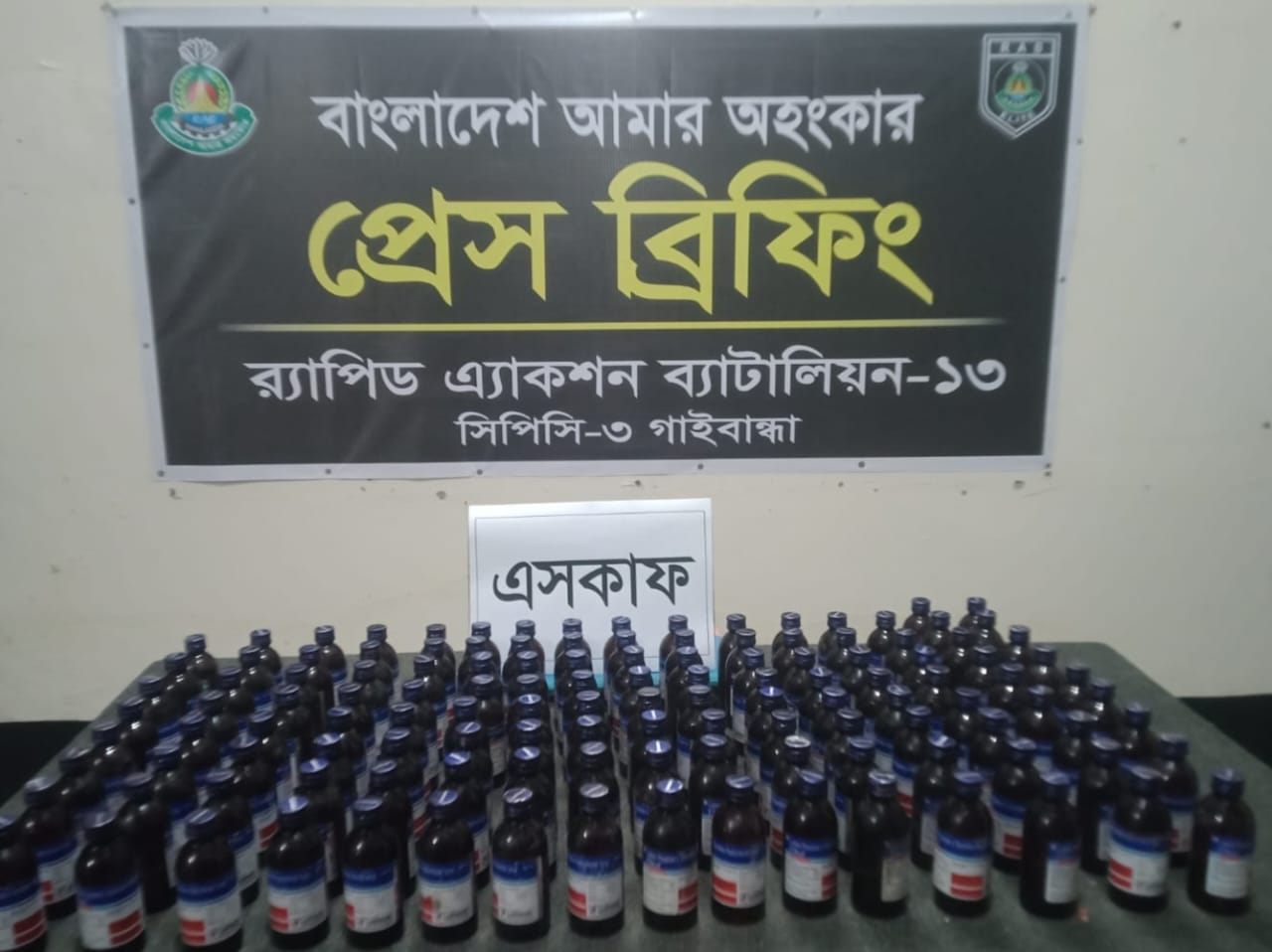 মাদক নির্মূলে র্যাব -১৩ নিয়মিতভাবে গোয়েন্দা তথ্য সংগ্রহ ও টহল কার্যক্রম এবং মাদকবিরোধী অভিযান ও চেকপোস্ট পরিচালনা করে থাকে। র্যাবের চলমান এই অভিযানের ধারাবাহিকতায় ইং ৩০/১১/২০২৫ তারিখে রাত ১০.২৫ ঘটিকায় সিপিসি-৩, গাইবান্ধা, র্যাব-১৩, রংপুর এর আভিযানিক দল গোপন সংবাদের ভিত্তিতে গাইবান্ধা জেলার গাইবান্ধা সোহাগ বোর্ডিং (আবাসিক) এর রুম নং-০৭ গ এর ভিতরে তল্লাশীকালে ধৃত ০১নং আসামি মোঃ আব্দুল মতিন এর হেফাজতে থাকা নেভি ব্লু রংয়ের ট্রাভেল ব্যাগের ভিতর হতে ৭১ (একাত্তর) বোতল এবং ০২নং ধৃত আসামি কামাল হোসেন এর হেফাজতে থাকা কালো রংয়ের ট্রাভেল ব্যাগের ভিতর হতে ৬০ (ষাট) বোতল সর্বমোট ১৩১ বোতল ফেনসিডিল জাতীয় মাদকদ্রব্য এসকাফ জব্দসহ ০১। মোঃ আব্দুল মতিন (৫০), পিতা-মৃত আব্দুল জব্বার মুন্সি, মাতা-মৃত সালমা বেগম, ০২। কামাল হোসেন (৬৫), পিতা-মৃত আব্দুল বাসির, মাতা-মৃত রাহেলা বেগম, উভয় সাং-রাউতনগর, ওয়ার্ড নং-০২, থানা-রানী শংকর কৈল, জেলা-ঠাকুরগাঁও আসামি‘দ্বয়কে গ্রেফতার করতে সক্ষম হয়।