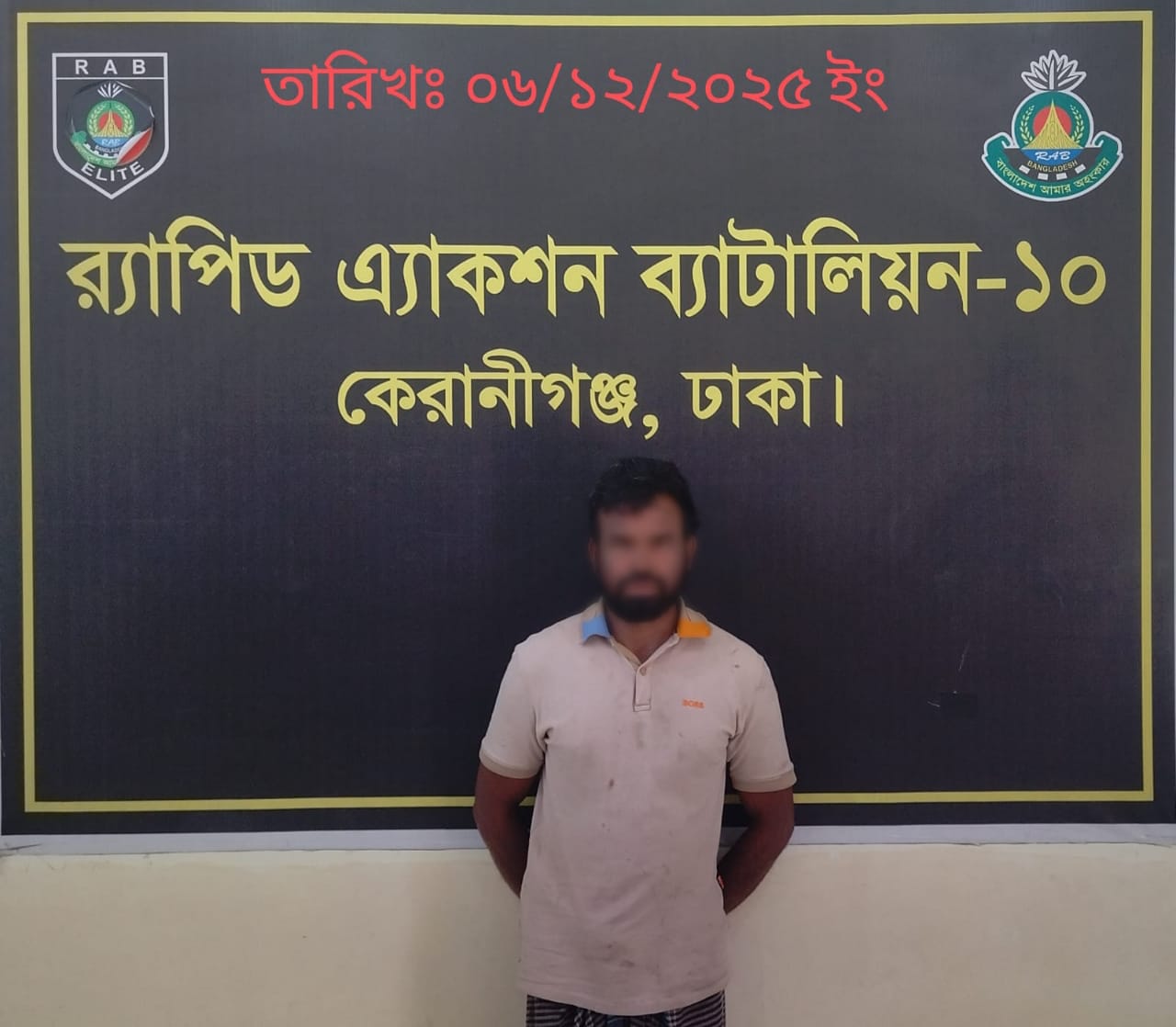 এরই ধারাবাহিকতায় ইং ০৬/১২/২০২৫ তারিখ দুপুর ০১.০০ ঘটিকায় সুনির্দিষ্ট তথ্য ও গোপন সংবাদের ভিত্তিতে র্যাব-১৩, সদর কোম্পানী, রংপুর এবং র্যাব -১০, সিপিএসসি, কেরানীগঞ্জ ক্যাম্প চাঞ্চল্যকর উক্ত হত্যা মামলার এজাহারনামীয় ০২ নং আসামি লেবু মিয়া (৪০), পিতা-আব্দুল জব্বার, সাং- কিসামত মেনানগর, থানা-তারাগঞ্জ, জেলা-রংপুর‘কে ঢাকা জেলার কেরাণীগঞ্জ মডেল থানাধীন কোনাখোলা দেয়াসুর মহুয়া নার্সারী এলাকায় অভিযান পরিচালনা করে গ্রেফতার করতে সক্ষম হয়।